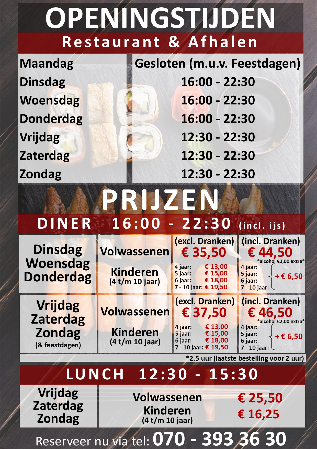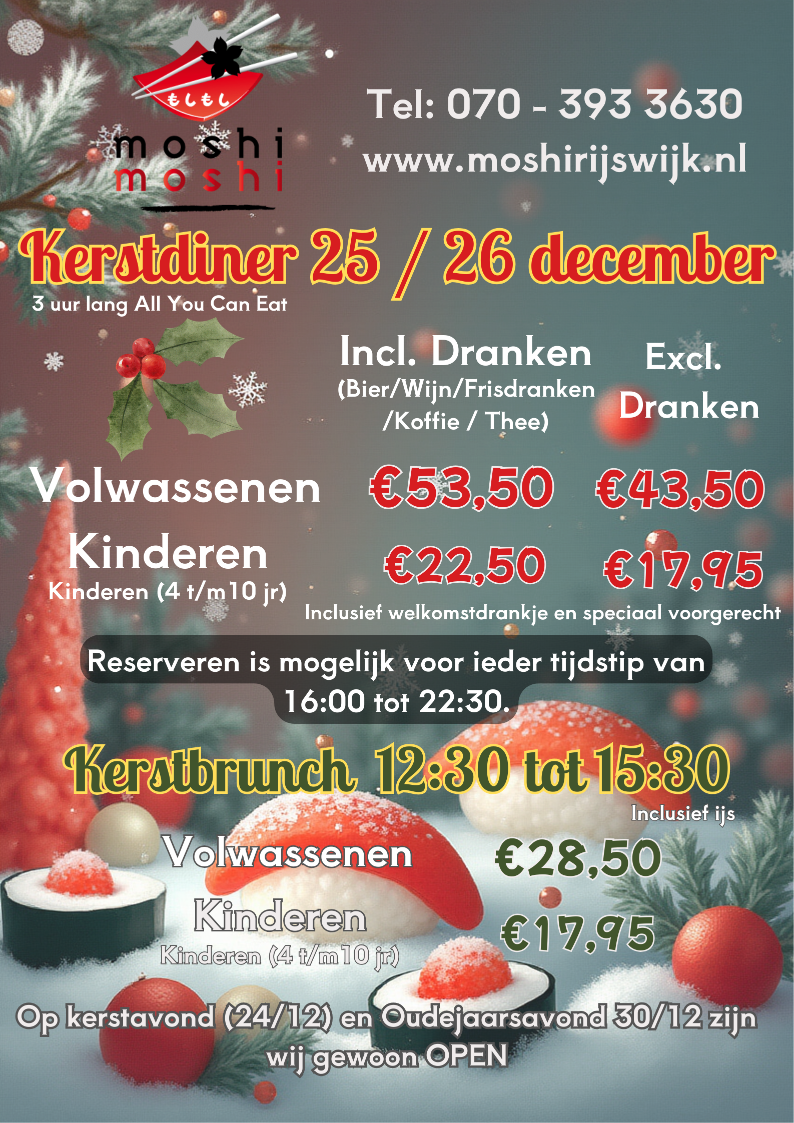 Welkom bij Moshi Moshi Rijswijk. Op een mooie locatie vlakbij Station Rijswijk kunt u genieten van heerlijke verse sushi’s, tempura, salades en teppanyaki gerechten (vis wordt dagvers geleverd). Ons all-you-can-eat concept biedt u de kans om alle lekkernijen uit Japan voor een vaste prijs te proeven.